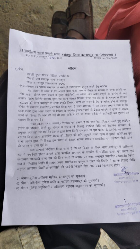 इसी खबर से नाराज होकर थाना प्रभारी द्वारा पत्रकार रामहरी गुप्ता को नोटिस जारी कर दिया गया है। नोटिस में कहा गया है कि भारत सम्मान चैनल और सोशल मीडिया के माध्यम से प्रसारित समाचार असत्य और भ्रामक है तथा इससे शासकीय सेवक की प्रतिष्ठा को नुकसान पहुंचा है। नोटिस में तीन दिनों के भीतर थाना बसंतपुर में उपस्थित होकर स्पष्टीकरण देने को कहा गया है, अन्यथा वैधानिक कार्रवाई की चेतावनी दी गई है।