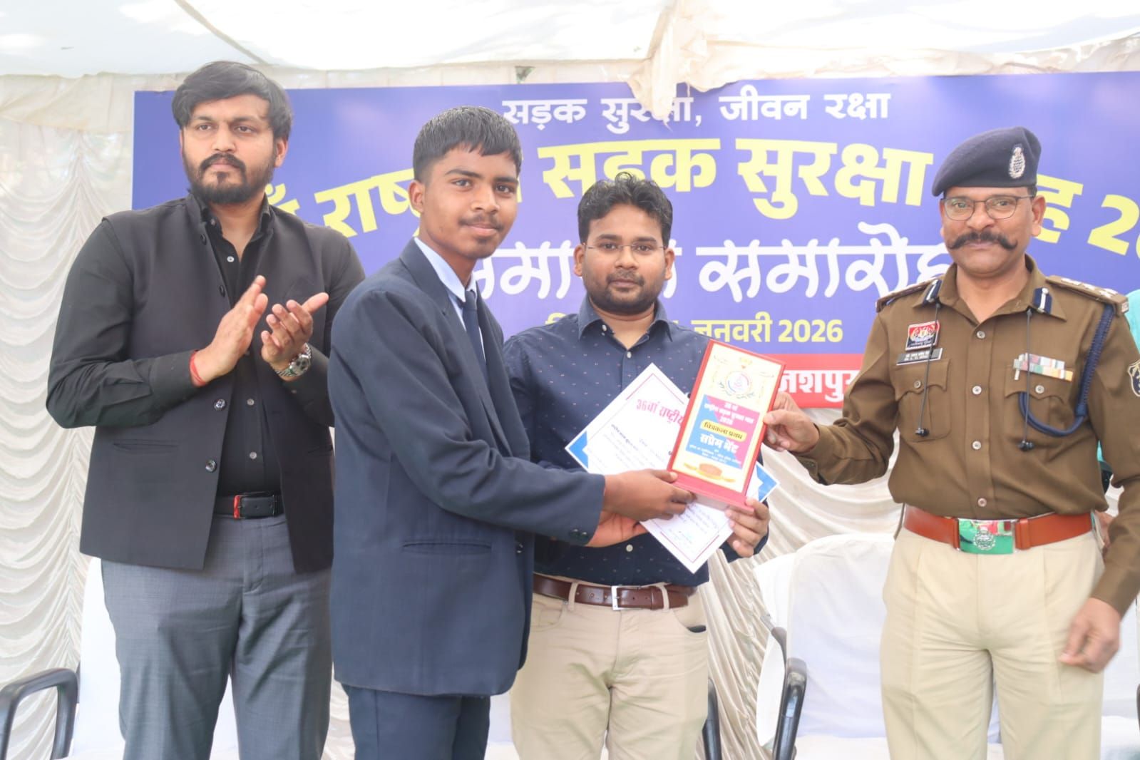 ➡️ कार्यक्रम में जशपुर पुलिस के द्वारा‘सड़क सुरक्षा – जीवन रक्षा’ थीम पर निबंध, चित्रकला एवं स्लोगन प्रतियोगिताओं का आयोजन भी किया गया, जिसमें उत्कृष्ट प्रदर्शन करने वाली छात्राओं को प्रशस्ति पत्र एवं मोमेंटो प्रदान कर सम्मानित किया गया।
