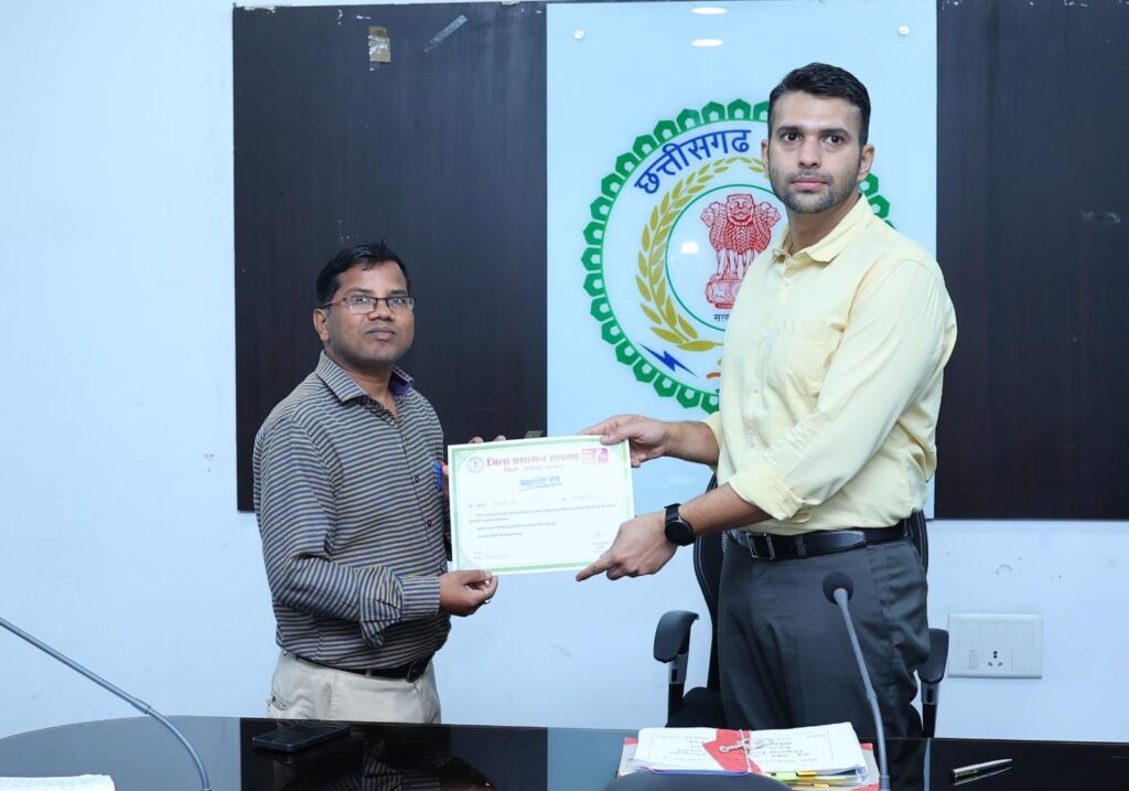 उल्लेखनीय है कि राज्य शासन द्वारा शासकीय कार्यों में पारदर्शिता, गति एवं गुणवत्ता लाने के उद्देश्य से इस विशेष नवाचार की शुरुआत 01 फरवरी 2026 से की गई है। इस व्यवस्था के अंतर्गत शासन द्वारा संचालित महत्वपूर्ण योजनाओं एवं कार्यक्रमों के सफल क्रियान्वयन में सक्रिय भूमिका निभाने वाले कर्मचारियों को सम्मानित कर उनकी सेवाओं को सार्वजनिक रूप से पहचान दी जा रही है। इस अवसर पर डीएफओ रायगढ़ श्री अरविंद पीएम, जिला पंचायत सीईओ श्री अभिजीत बबन पठारे, नगर निगम आयुक्त श्री बृजेश सिंह क्षत्रिय, अपर कलेक्टर श्री अपूर्व प्रियेश टोप्पो, श्री रवि राही, डॉ.प्रियंका वर्मा, संयुक्त कलेक्टर श्री राकेश गोलछा, श्रीमती पूजा बंसल, डिप्टी कलेक्टर श्री धनराज मरकाम सहित विभिन्न विभागों के जिला स्तरीय अधिकारी उपस्थित थे।